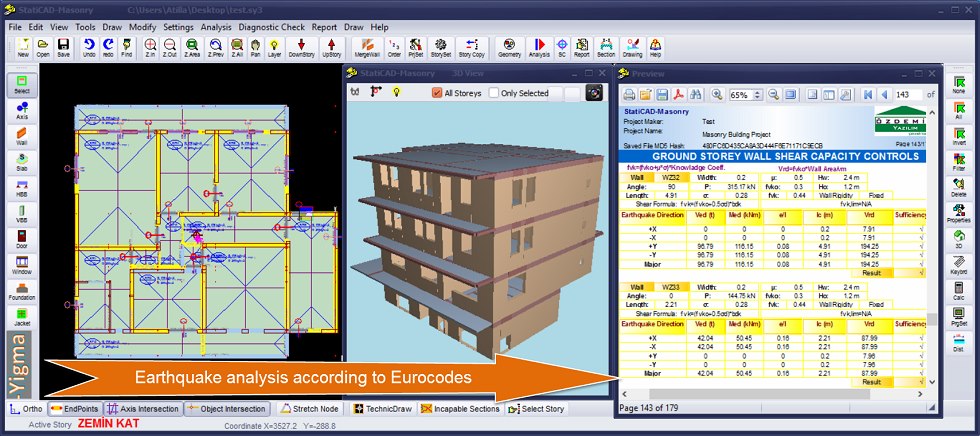 Calculation of the building performance level and risk situation, calculation of the risky buildings static/geometrical parameters , calculation of Strengthened condition and current situation , Risky building Management or Obtaining Results that Match the Criteria of Earthquake Management The program calculates and reports all of the static parameters required by the regulations of Eurocode 6 and Earthquake Management. There is no extra calculation needed after the program’s calculation.