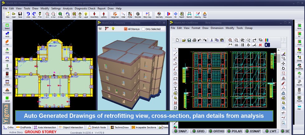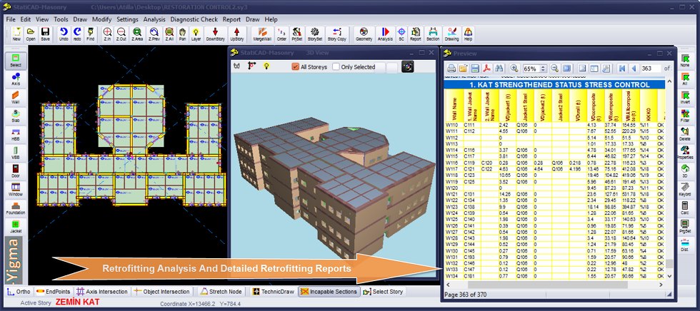 Drawn building on the screen can be viewed in three dimensions simultaneously with the graphical interface. The program is quite practical for use. For example , walls and bond beams are drawn at the same time and when the doors/windows created in the wall program automatically divides the wall into two parts, it automatically creates the horizontal bond beams on the doors and Windows; creates a piece of wall on the doors/windows and a piece of wall at the bottom of the wall. It can select and arrange multiple components. Modelling process of a building can be completed in 2-3 hours. Reports and drawings can be taken in a single analysis. StatiCAD has graphical interface for modelling building.