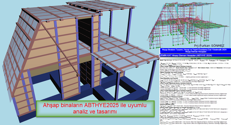 Analizde program düşey yük, deprem yükleri ve kar yüklemelerini de dikkate alan 87 adet ahşap binalar için yönetmelikte tanımlanması istenen yük kombinasyonunu otomatik tanımlar, deprem yüklerini ve eleman iç kuvvetlerini otomatik hesaplar. Ahşap Perde elemanlarda TBDY2018 e göre kesme kapasitesini otomatik hesaplayıp yeterlilik durumunu raporlarda belirtir. Ahşap eleman hesaplarını da ABTHYE Dayanıma göre tasarım bölümüne uygun olarak Liflere Paralel Doğrultuda Çekme Gerilmesi Kontrolü, Eğilme Etkisinde Sınır Durum Kontrolü, Yanal Burkulma Sınır Durumu, Liflere Paralel Doğrultuda Basınç Gerilmesi Kontrolü, Liflere Paralel Doğrultuda Kayma Gerilmesi Kontrolü, Yuvarlama Kayma Gerilmesi Kontrolü, Burulma Momenti Etkisi, Bileşik Etkiler (Eğilme Momenti ve Eksenel Kuvvetler), Liflere dik doğrultuda basınç hesap esaslarına bağlı kalarak nem ve boyut katsayılarını da dikkate alarak yeterlilik kontrollerini yapar. Programda ahşap elemanlar ahşap yapı sistemi içinde tanımlanabildiği gibi diğer yapı sistemlerinde de (yığma veya betonarme) tanımlanabilmektedir. Ayrıca istenirse TS647 esasları uyarınca kirişlerin kesit ve sehim tahkikleri de yapılabilmektedir